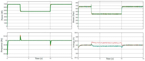 The findings depicted in Figure 12 present the outcomes obtained by employing the identical controller configuration, which was adjusted to maintain voltage levels while disregarding the sharing of reactive power (with = 0). Although the regulation of voltage levels is stringent, as in Section 3.1, the sharing of reactive power among the units is unsatisfactory. In this case study, three constant loads are operated at the start of the simulation, and another load is added at unit 2 at t = 3 s and disconnected at t = 10 s.