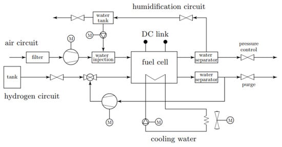 Note that the power plant of Figure 2 includes several operating fluid machines: the air compressor, the hydrogen circulation pump, the humidifier water circulation pump, the coolant pump, and the cooling fan of the heat exchanger. Simpler configurations are often used in the aerospace field where self-humidified stacks are adopted, and the cooling fan can be omitted [42]. In some cases, a two-level cooling system is adopted consisting of high-temperature and low-temperature circuits [43].