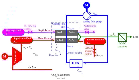 The configuration of Figure 3 refers to an aerospace application and shows the air circuit in red, the hydrogen circuit in magenta, and the electric flows in green. The cooling system is represented in blue. The control volume identified in the figure will be used in this work to model the stack voltage and temperature. The main nomenclature used in the description of the subsystems is also reported in the figure.