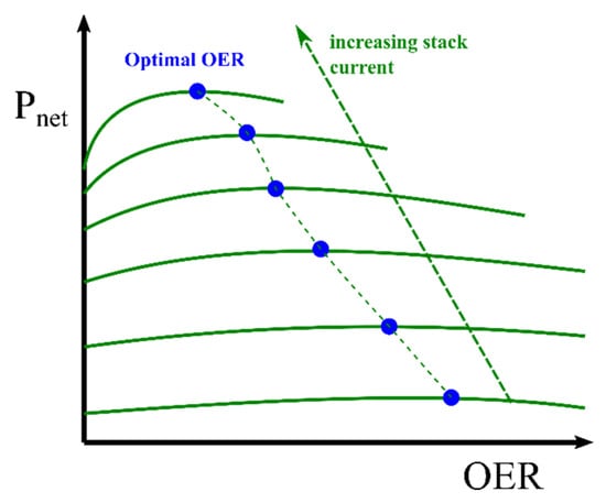 As already explained, the main control action to protect the cell and optimize its performance is the Oxygen Excess Ratio (OER) [36]. The typical curves of the net power as a function of the OER for each value of stack current are shown in Figure 5. At constant current (green lines), the net power initially increases with OER because of the improved reaction rate until reaching a maximum (blue circle). For higher values of the OER, the net power declines due to the increased power absorbed by the compressor. The net power increases with current, but the range of feasible OER becomes narrower because of the compressor limits. This leads to identifying an optimal value of OER for each value of the current that is used as a setpoint for the control of the CCPEMFC [72,73]. The optimization of OER was found to increase the net power by about 3.5% in [74].