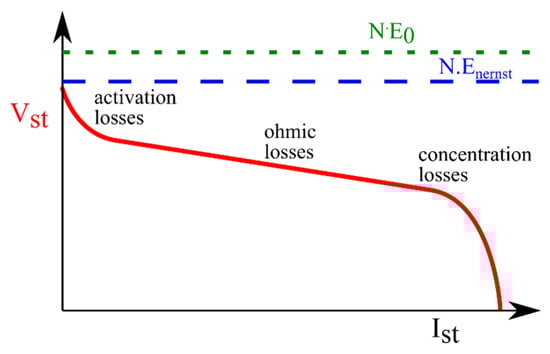 The Nernst voltage is the theoretical voltage that the fuel cell can develop at a certain pressure of hydrogen and oxygen. When the fuel cell is connected to the load and a current is drawn, the voltage decreases because of reaction activation, crossover, internal currents, ohmic losses, and mass concentration limitations [1,6]. These phenomena take place at all values of the current, but as the current increases, activation, ohmic, and mass concentration limitations become more relevant in this order, as shown in Figure 6. Note that the open-circuit voltage is slightly lower than the Nernst voltage.