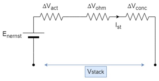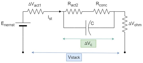 Equivalent resistors are used in equivalent electric circuit models for activation, ohmic voltage, and concentration voltage drops. The most common equivalent electric circuit for a PEMFC stack is shown in Figure 7. The model is usually referred to as a single cell, but by multiplying it by the number of cells in series (N), it is possible to obtain the voltage of the whole stack [84].