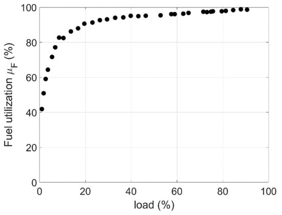 where is the fuel utilization rate [40], defined as the ratio between the flow rate of hydrogen that reacts in the stack, divided by the inlet fuel flow rate. This value is assumed to be equal to 0.95 in [45] and 0.9 in [46], depending on the anode configuration. In a dead-mode anode with a purging valve, the fuel utilization depends on the managing of the purging process. is the electric equivalent of the hydrogen heating value that corresponds to 1.462 V or 1.254 V if calculated from the higher heating value (HHV) [47] or the lower heating value [40], respectively. The voltage of the fuel cell, , is significantly lower than , mainly because of the three typical loss phenomena of electrochemical devices, namely activation, ohmic, and concentration losses [6].