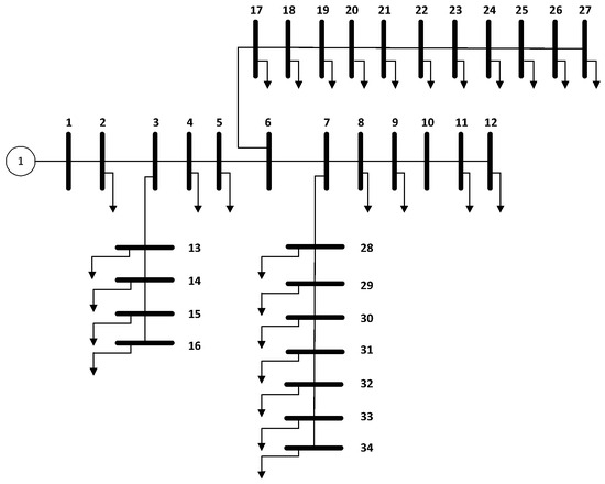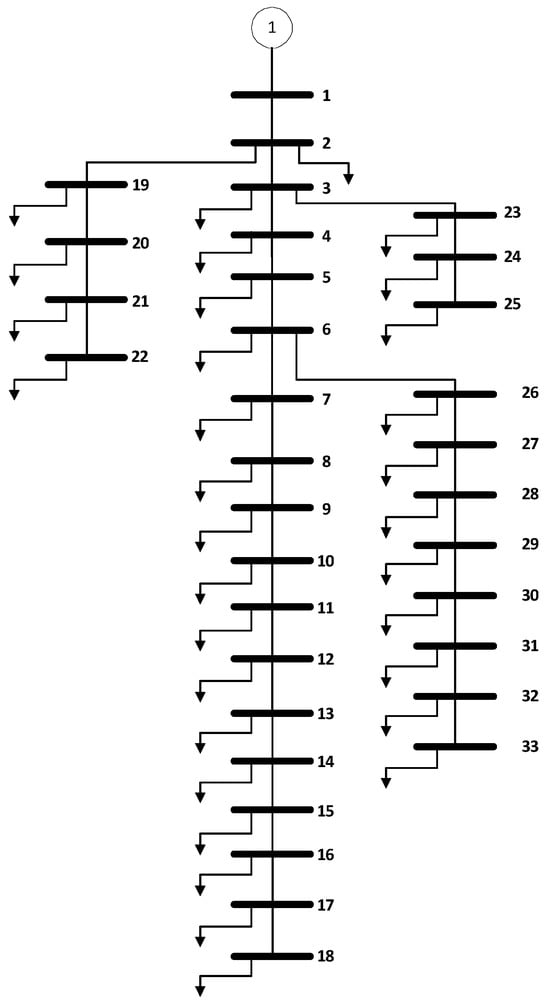 The 33-bar system establishes a base voltage of 12.66 [kV] and a base power of 10 [MVA]. The total load installed in this system is 3715 [MW] of active power and 2.3 [MVAr] of reactive power. The graphic representation of the system is presented in Figure 3.