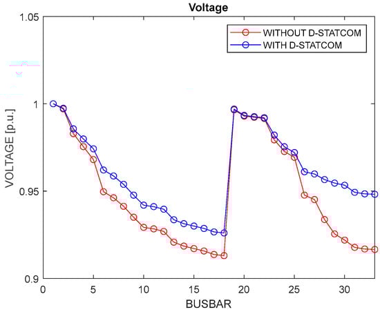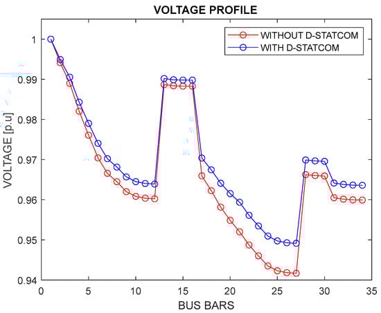 The red line represents the voltage level at each node in the scenario without reactive compensation. The blue graph represents the voltage profile when incorporating a DSTATCOM of the power and at the location determined using the algorithm.