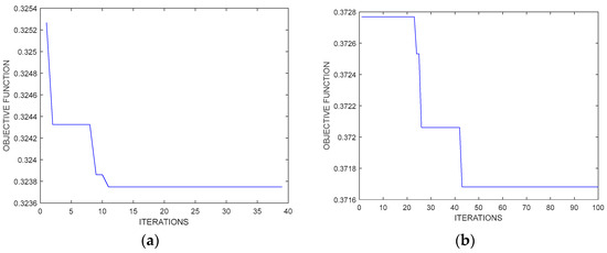 The behaviour of the objective function for the scenario without the harmonics restriction and for the scenario with the harmonics restriction is presented in Figure 15. This graph represents the evolution of the value of the objective function as a function of the iterations. It can be seen that a satisfactory result is achieved for the two proposed scenarios.