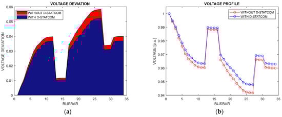 Figure 12. Voltage deviation in scenario 2 for the 34-bar system (a). Voltage profile in scenario 2 for the 34-bar system (b).