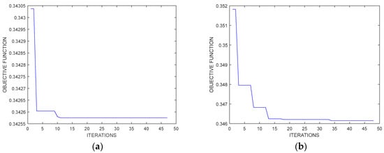 Figure 9. Evolution of the objective function for scenario 1 without THDv restriction (a) and scenario 2 with THDv restriction (b).