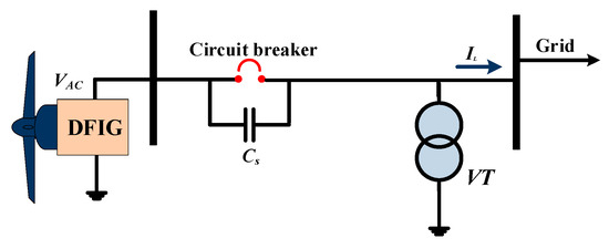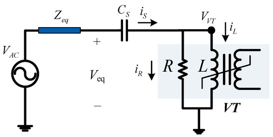 The schematic representation of the ferroresonance equivalent circuit is shown in Figure 2, where the doubly-fed induction generator (DFIG) is modeled as an AC source connected in series with its Thevenin impedance, and the VT is modeled as a nonlinear inductor in parallel with a resistor (R) and a capacitor, which represents the open breaker, as suggested in [27].
