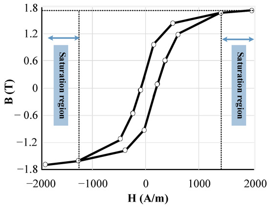 In this subsection, a simulation of the ferroresonance phenomenon in a wind energy system is performed. The electrical system, as illustrated in Figure 1, is composed of wind generators and their VTs. The simulation focuses on the voltage of VT and the magnetic flux of its core, as they provide valuable insights into the nature of the voltage signal and its relationship with the flux supplied by the wind generator. The magnetic saturation of the VT core is shown in Figure 3, with saturation occurring at approximately 1.8 T. The magnetization curve has been obtained based on measurements on realistic VTs installed in a local utility grid. It is noteworthy that this magnetic behavior is characterized in grain-oriented steel M4. The key system parameters used in the simulation are listed in Table 1.