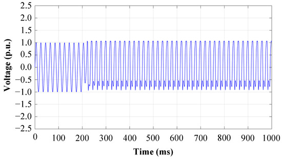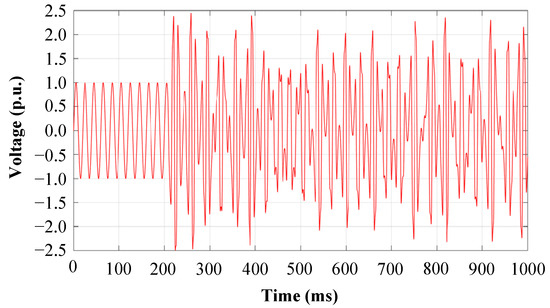 Here, the effects of the SSFSC operation on the ferroresonance phenomenon of VT are analyzed through simulation analysis. The simulation parameters consider a secondary voltage of 12 V and a capacitor bank with a capacity of 50 mF charged by a 15 V battery bank. It is to be mentioned that the battery unit should be capable of supplying the current required to cancel the excess magnetomotive force (mmf) in the VT core due to ferroresonance. Additionally, the capacitor bank is responsible for providing the transient energy needed in each duty cycle. If the capacitor’s value is insufficient, the energy stored in the capacitor will discharge during the current injection interval, and the circuit will not perform as intended. Here, practical values have been selected which are attainable with commonly available circuit components. The results of the simulation are presented in Figure 10, which shows the primary voltage of VT when the circuit breaker opens the power line at t = 200 ms. The simulation results demonstrate that the maximum voltage of VT is effectively limited to 1.05 p.u. through the operation of the SSFSC, resulting in a significant improvement in the nonlinear oscillation. Furthermore, the MHCC of the voltage waveform in Figure 10 is increased to 78%, and its maximum RVR is limited to 13.2 kV/ms. The results indicate that the operation of the proposed SSFC during ferroresonance conditions improves the MHCC and RVR indexes to the desired values of 100% and 10.29 kV/ms, respectively.