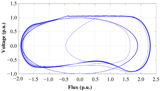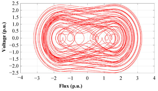 The relation of VT voltage and its magnetic flux is demonstrated in Figure 6, referred to as the Poincaré section of the flux-voltage, where the domain of flux variation is between −3.2 and 3.2 p.u. Moreover, the maximum voltage of VT reaches nearly 2.5 p.u. when the magnetic flux exceeds 1.0 p.u.