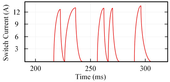 In response to the fired pulses, the IGBT switches start conducting. Considering the resistive and inductive (RL) nature of the VT secondary as the bridge load, the switch currents will be in the form of exponentials, as shown in Figure 14, illustrating the switch currents in the interval between 200 ms and 300 ms.