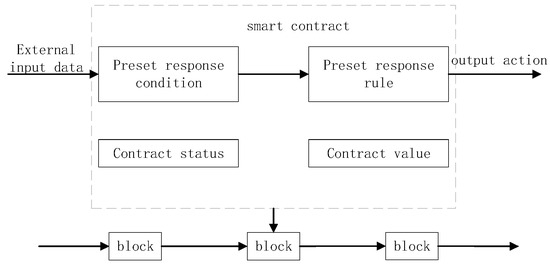 where: is the user information update model, the update information includes user personal identification number, user wallet balance, user credit score, and other information; is the user quotation model, the model includes user quotation, user quotation, user declaration time stamp, and other information; is the smart trading matching contract, the contract includes bilateral auction contract, and peer-to-peer trading contract; is the user credit evaluation model; is the trading settlement model, the model includes credit settlement and energy final delivery settlement. The principle of smart contracts is shown in Figure 3: