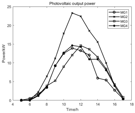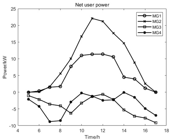 As shown in Figure 7, the PV output power of MG1 and MG2 is much greater than the customer load and the net PV power is greater than 0. Therefore, MG1 and MG2 are sellers. The PV output power of MG3 and MG4 is less than the load and the net PV is less than 0. Therefore, MG3 and MG4 are the purchasers. All sellers are classified as seller user groups and all buyers are classified as buyer user groups. The traded power varies in each time period, and the total power purchased by the buyer customer group, and the total power sold by the seller customer group are shown in Table 1.