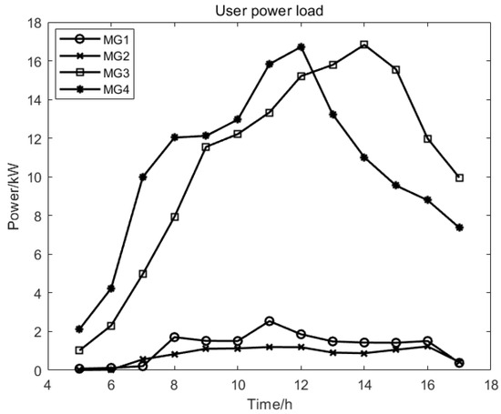 The distributed PV selected for this paper consists of four users, each with a PV system and a smart meter. PV systems and smart meters have the same parameters and different customer installed capacities. Smart meters are used to record the amount of electricity sold and purchased by customers. The initial load and PV power real-time status of each user in a township microgrid in Shanxi are shown in Figure 5 and Figure 6. Considering the fluctuation of PV power and customer load, 1 hour is chosen as a time period for calculation. The 1 h interval is used in microgrid transactions because it is suitable for capturing electricity market price fluctuations, renewable generation forecasts, operational efficiency, and matches the electricity market settlement cycle. This time interval allows the microgrid to better cope with price and energy fluctuations in real-time transactions. The price for local PV users is 0.77 RMB and the grid price is 0.85 RMB.