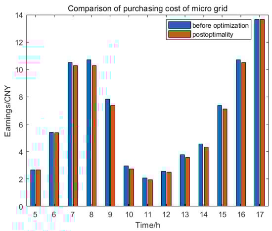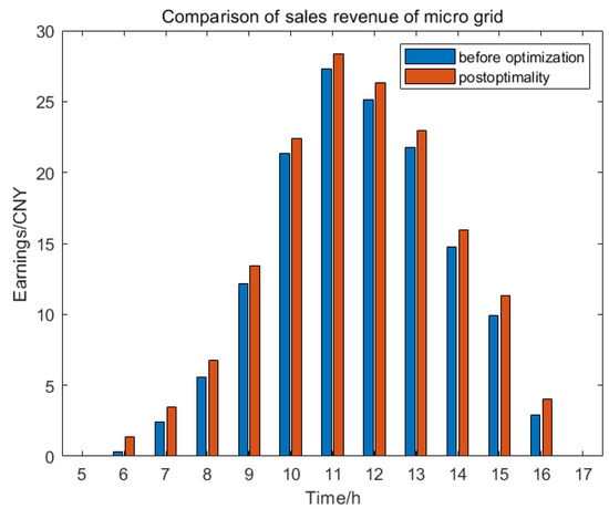From Table 3, it can be seen that the internal electricity price is greater than 0.77 CNY/(kw·h) in the trading period of for both the electricity selling and purchasing customers. At this point, the total power sold is greater than the total power purchased, and the power purchasers in the microgrid purchase power from the power sellers at the internal tariff. The excess PV power needs to be sold to the grid at a “residual feed-in” tariff. Since the internal tariff of microgrid is between the “surplus feed-in” price and the grid sales price, the cost of purchasing electricity is reduced and the benefit of selling electricity is increased.