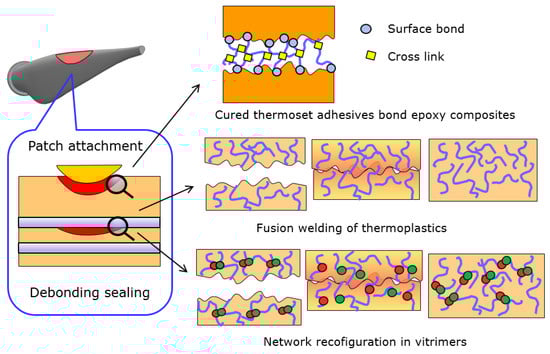 - The common feature of thermoplastic and reversible thermosets composites is that polymers can be dissolved, transformed, or depolymerized by using thermal or chemical triggers. This opens a path to the new, additional repair technologies, different from the adhesive joining typically used to repair wind turbine blades now. Among these new technologies, one can mention fusion welding, e.g., [96], heating plus pressure, surface degradation and solvent-assisted welding, and repair with dissolvable adhesives.