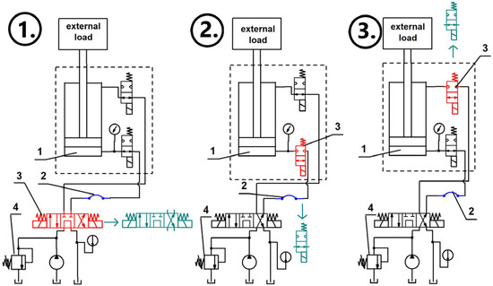 In the case of systems 2 and 3, two valves must be reconfigured in order to maintain liquid supply to the system, and this fact theoretically increases the response time of a cylinder actuated under mass load. The first valve is the 2/2 controlled valve, and the second is the pressure relief valve (No. 4 in