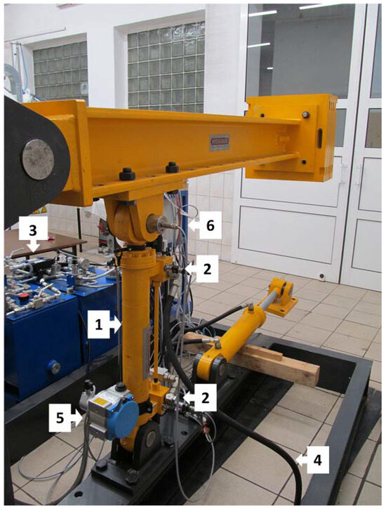 Figure 2). The aim of the pilot tests performed in the next step was to identify such a position for the cylinder in the system provided with a mass load of 500 kg installed at the end of the boom that would prevent the maximum pressures in the supplied chamber during startup from exceeding 85% of the pressure value set on the relief valve. As a result, it may be assumed that when the cylinder under load was actuated, the pressure relief valve did not open due to pressure rise in the power supply line. This hydraulic system was used in all tests, and only the control system was modified. Therefore all parameters of the system were identical, enabling a comparative analysis. The employed hydraulic oil was HLP type with the 68 viscosity grade. All of the tests were performed on the warm hydrostatic system—the oil temperature was 45 ÷ 55 °C.