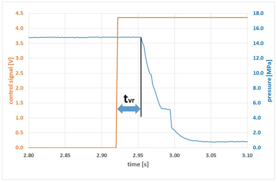 The response time for the 2/2 valve on the power supply line (system 2)—tvr_2 = 29 ms for pressure difference equal to 12 MPa (standard deviation of population for the results was 20 × 10−4 s);
