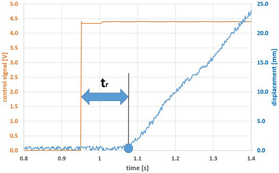Based only on the experimentally identified valve opening times, it may be concluded with some degree of approximation that as the opening time of the 4/3 valve corresponds to the theoretical response time of the system, as the beginning of the movement process depends only on the reaction of this valve. A more precise identification of the response time requires allowing for thepropagation time of the pressure wave in the power supply line. As a result, the response time of system 1 should be extended with the time (t