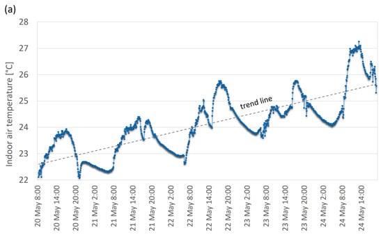 The indoor air temperature ta, during the first measurement period, ranged between 26.9 °C and 29.0 °C, while the average value was 27.9 °C (Table 3). The trend line shown in Figure 8a illustrates the increase in mean indoor air temperature as a result of energy accumulation from day to day. The average value of the radiation temperature of the surrounding surfaces was 28.8 °C, while the average relative indoor air humidity was 58.28% (Table 3).