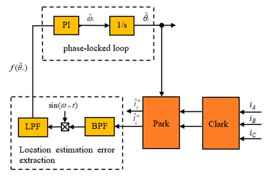 Low-speed rotor position detection technology usually uses closed-loop control algorithms, i.e., high-frequency signal injection, which works by applying a certain frequency of voltage or current signals to a certain phase of the motor windings, relying on the motor’s convex characteristics of the associated high-frequency current or voltage signals that contain position information and then digitally processing the signals to acquire position information. From the different types and forms of injected signals, high-frequency signal injection can be categorized into rotating high-frequency voltage injection [19,20,21] and pulse high-frequency voltage injection [22,23,24,25]. Although this method is simple, efficient and stable, the signal processing process is complicated. The dynamic performance decreases because of the introduction of a variety of filters and various non-ideal factors leading to a decrease in the position detection accuracy. Pulse high-frequency voltage injection detects the current signal by introducing a high-frequency voltage into the two-phase rotating coordinate system, which is a relatively simple structure and has a high position detection accuracy. It is suitable for both convex-pole and hidden-pole motors.