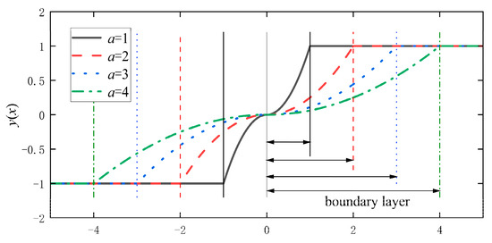 where x is the system state error, i.e., the difference between the current observation and the true value, and a is the boundary layer thickness. From Equation (16), the segmented composite function consists of a symbolic function and a power function, which effectively ensures the smooth connection of its internal function, as shown in Figure 3. In the boundary layer near the zero point, i.e., and , the control function is a power function change and is smooth and continuous near the zero point. The saturation characteristics of the symbolic function are used outside the boundary layer to ensure the robustness of the system.