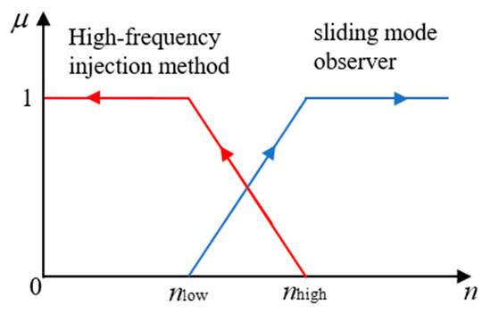 To guarantee minimal speed and position fluctuations during the transition phase, the combination of the two methods is usually realized using hysteresis loop switching or weighted switching [35]. A composite control strategy was proposed through a phase-locked loop by normalizing the rotor position error estimated through the two position sensorless control techniques.