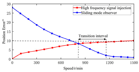 As shown in Figure 6, the two algorithms have a position error threshold of about 10°, within which the IPMSM drive control system is less affected. The selection of needs to be larger than the minimum stable speed that can be obtained by the SMO. The selection of needs to be smaller than the maximum stable speed that can be achieved by the high-frequency signal injection.