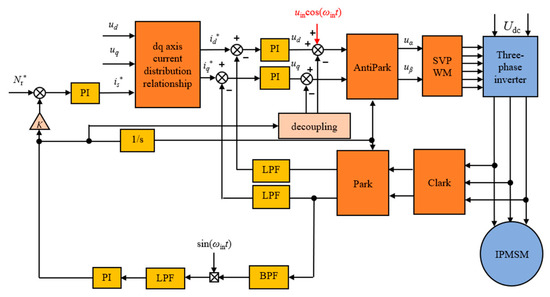The sensorless control model is constructed as shown in Figure 7. The current signal in the current sensor is obtained by injecting a high-frequency cosine voltage signal into the d-axis. The current obtained by coordinate transformation is employed to filter out the high-frequency component using a low-pass filter.