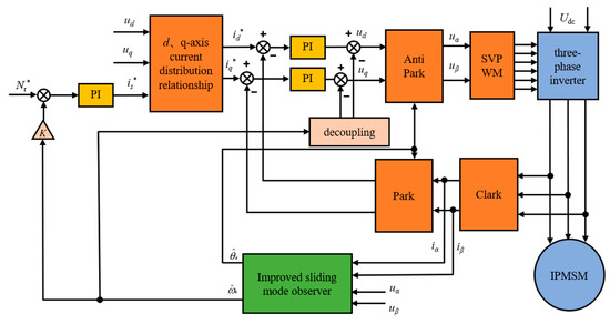 When the PMSM is operating in the middle and high-speed section, the high-frequency signal injection method will cause interference between signals, with a low signal-to-noise ratio, and it cannot extract useful signals, so it is no longer applicable. As the speed increases, the reverse potential and magnetic chain information in the motor are easily extracted, so the rotor position estimation technique is often based on the relevant physical quantities in the mathematical model [26]. At this stage, the main rotor position estimation techniques include the direct estimation method [27,28], extended Kalman filter method [29,30,31] and sliding film observer method [32,33,34]. The extended Kalman filter is an efficient and flexible nonlinear system state observer. This filter possesses the capability of adaptive adjustments and can provide real-time estimation of the system’s state, making it suitable for a wide range of operating speeds. Furthermore, its performance may be significantly affected by the empirical selection of parameters, and it may exhibit control oscillations. Sliding mode observers, on the other hand, represent a class of nonlinear observers whose structure adapts with changing system states. In theory, these observers share similarities with hysteresis control and fall under the category of non-continuous control strategies. Sliding mode observers are robust to external disturbances and exhibit strong adaptive capabilities, while their implementation is relatively straightforward, making them widely adopted in sensorless control applications. These observers offer good robustness against system model uncertainties and disturbances. However, traditional sliding mode observers are known for severe system chattering, which is an undesirable characteristic.