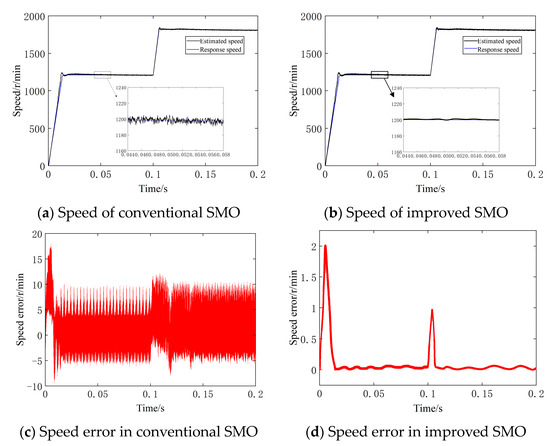 Figure 11 provides a comparison of the speed performance between the conventional SMO and the improved SMO. It can be concluded from the local enlarged drawing in Figure 11a that the speed estimated by the conventional SMO contains a large high-frequency jitter error, which results in lower efficiency when the system is running. From the partial zoomed-in plot of Figure 11b, it can be deduced that the high-frequency component of the improved SMO is considerably reduced, resulting in enhanced estimation accuracy. From Figure 11c, it can be obtained that the maximum error reaches 18 r/min in the initial state and 13 r/min in the abrupt shift of the rotational speed. After the speed reaches 1200 r/min, the speed error is about −5~9 r/min. After the speed rises to 1800 r/min, the rotational speed error is about −5~12 r/min. The rotational speed estimation error is large. It contains high-frequency components, causing the system to jitter. From Figure 11d, compared to the traditional SMO speed error, the rotational speed error of the improved method is greatly decreased, and there are fewer high-frequency components. In the initial state of the system and the sudden speed change state, the maximum error is about 2 r/min and 1 r/min. The initial state has a larger error due to the smaller magnitude of the back electromotive force. After smooth operation, the speed error will be about 0.1 r/min. The improved SMO system tracks better.