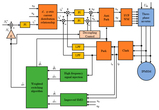 IPMSM possesses advantages such as high power density and strong overload capacity [1,2], which is widely used in the field of new energy vehicles [3,4,5,6]. Sensorless control technology has emerged as a prominent research area [7,8,9,10,11,12]. The fault-tolerant control algorithm without a position sensor does not use the position signal provided by the position sensor in the PMSM drive control system. It relies on the software algorithm to provide position information, which reduces hardware costs and improves system efficiency [13,14]. In order to accurately acquire the rotor leading position according to different speed stages, the position sensor fault-tolerant control technology is divided into a low-speed section using the rotor information detection of the motor’s convex pole characteristics and the medium to high-speed section using the rotor information estimation technology of the motor’s mathematical model, as well as the composite control technology between the low-speed and the medium- and high-speed sections [15,16,17,18].