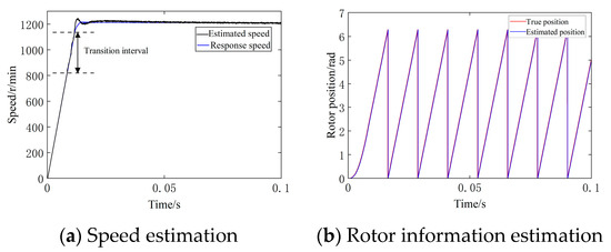 Based on the rotor speed estimated by the high-frequency signal injection and the SMO, the rotor signal is output according to the switching control method. The stability of the weighted switching algorithm is verified. The control performance results of combining the two control algorithms are depicted in Figure 14. The starting speed is 1200 r/min. The constant load is 20 N-m. The simulation time is 0.1 s.