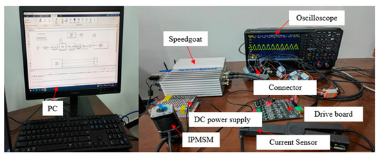 The Rapid Control Prototype platform consists of an IPMSM, a motor driver board, a current clamp, an oscilloscope, a DC power supply, a Speedgoat hardware system and connectors. Different algorithms and working conditions are set by the control software in the PC, which makes it easy to carry out multiple experiments to verify the control algorithms. The Speedgoat hardware system acts as the motor controller in the hardware platform, and the software level between Speedgoat and the PC communicates through the TCP/IPv4 protocol. Their IP addresses are within the same channel, and the hardware connection is achieved through a network cable.