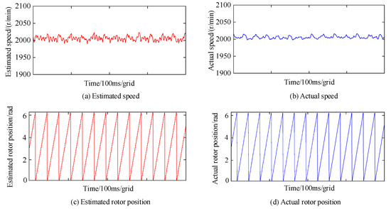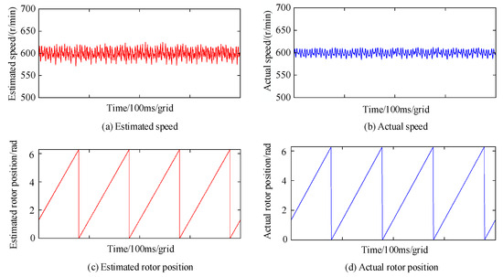 The above experimental platform was used to complete the experimental verification under steady-state working conditions. The speed conditions were set to 600 r/min and 2000 r/min to validate the performance of the control technology under low-speed and medium-high-speed conditions. As shown in Figure 16 and Figure 17, the experimental waveforms are shown under different speed conditions. The sensor-less control technique can estimate the actual speed and rotor position at low and medium-high speeds, although the estimated value fluctuates greatly compared with the actual value. The estimated speed fluctuates between the actual speed and the target speed, and the estimated rotor position effectively tracks the actual rotor position. The steady-state error of the estimated motor speed relative to the target speed is about 3% at low speeds and about 1% at medium and high speeds. The results of the speed tracking error at this speed condition are shown in Table 3. From the table, the average error of speed estimation is 8.23 r/min and 7.21 r/min at low and medium-high speeds, respectively. The above results confirm the estimation effect of the control technique at low and medium-high speeds.
