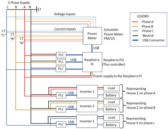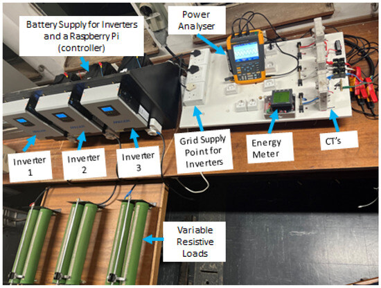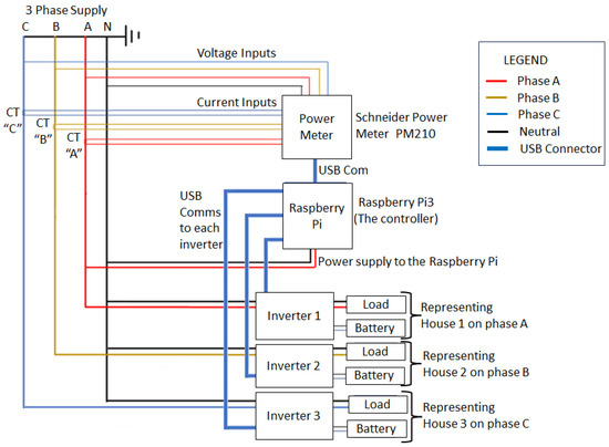 A laboratory setup was designed, built and tested to replicate a real-world scenario of the utility low-voltage network featuring small-scale embedded generators (SSEGs), as shown in Figure 13. The figure shows a three-phase power supply with a phase-to-phase voltage of 400 V and a phase-to-ground voltage of 220 V, representing the power utility supplying the LV network. The batteries connected to each single-phase inverter (1 kW) are lead–acid types of 12 V DC and 100 AH each. To measure currents on each phase, three current transformers were incorporated into the setup. Additionally, an energy meter connected to the transformer was configured to record and store phase currents that supply individual single-phase loads. The meter data are extracted through the MODBUS communication protocol and saved to a Raspberry Pi4 microcontroller. The Raspberry Pi4 microcontroller is responsible for regulating inverters 1, 2 and 3 in the event of an unbalance beyond acceptable levels. The controller communicates with the inverters via the CRC protocol. This enables remote adjustments to their mode of operation and settings, with the aim of achieving a more balanced utility supply. Experimental results were then verified using a power analyzer to validate the measurements obtained from the energy meter and the inverters.