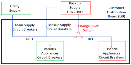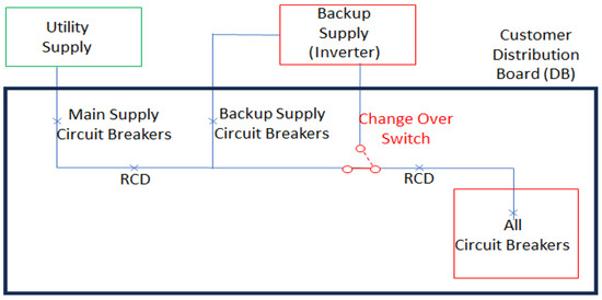 According to [24], low-voltage single-phase customers with a backup supply (alternative supply) can choose either a full or partial backup supply, as illustrated in Figure 2 and Figure 3. The backup inverter, which is of the hybrid type, features two AC terminals: one for the grid connection and another for the load. Additionally, it has two DC terminals: one for battery connection and the other for solar PV. The AC load side of the inverter is connected through a selector switch (known as a change-over switch) before the load supply circuit breaker. The primary purpose of the change-over switch is to provide a bypass option in case the inverter is either malfunctioning or not in use. In this configuration, the inverter is limited to supplying power to the load and cannot transfer power back to the utility, thereby ensuring the installation remains protected from causing over-voltage situations and from becoming dangerous to utility personnel who might be working on the network.