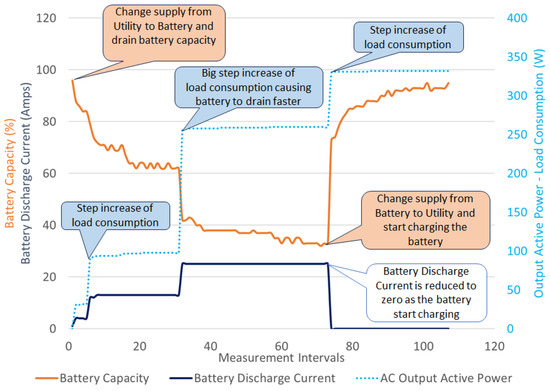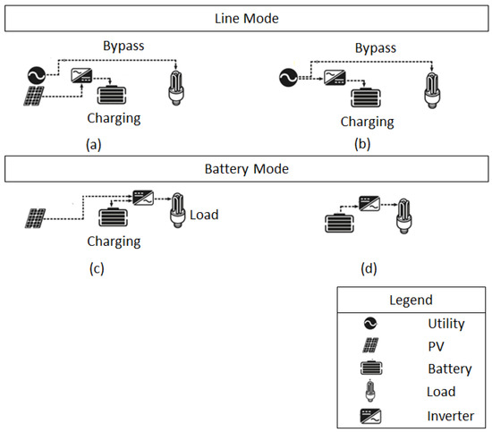 Figure 6 shows the hybrid inverter, which serves as an integration interface connecting DC-generated solar power, the utility grid and battery storage. The hybrid inverter has the ability to identify supply interruptions in the utility grid and seamlessly switch to an alternative power source based on predefined internal settings of supply priority. Furthermore, the inverter can be controlled via serial communication to execute specific functions whenever needed. This communication employs the cyclic redundancy check (CRC) protocol, which ensures a high level of data integrity by performing error checks. The inverter has two operational modes: line mode and battery mode. In line mode, the inverter can function in bypass mode, directly supplying power to the load from the utility while also charging the battery via solar PV panels, as shown in Figure 7a. In cases where there are no solar PV panels, the battery will be charged by the utility, as illustrated in Figure 7b. In the battery mode, the load can be supplied either from solar PV, the battery or both sources simultaneously, as shown in Figure 7c,d. In the absence of solar PV, the load can only receive power from the battery. The laboratory simulation is conducted using Figure 7b,d since there is no solar PV connection to the inverter.