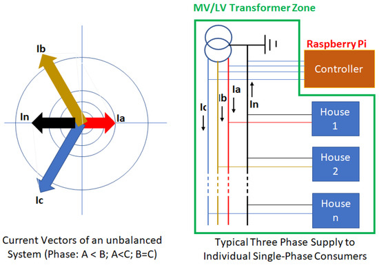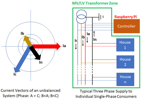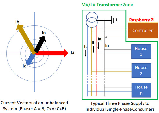 The introduction of distributed energy resources (DERs) into distribution grids necessitates the implementation of reliable and precise monitoring systems to improve both grid performance and the overall quality of power supply. Many utility companies have taken the initiative to install phasor measurement units (PMUs) within medium-voltage grids (MVDGs) and low-voltage distribution grids (LVDGs) for active network monitoring and subsequent performance improvement. The effectiveness of this monitoring approach was validated successfully through numerical simulations in [12]. Aligned with this initiative, this study investigates the utilization of a fast reporting measurement and control device situated in the MV/LV transformer zone, specifically on the LV side of the transformer. This device takes advantage of the existing grid-tied and hybrid inverters connected on the customer side, eliminating the need for the utility to install additional measurement devices. The objective is to harness the customer devices, which already provide essential measurements, to enhance the performance of the supply network. It is important to highlight that, since MV/LV transformers are distributed along the MV feeder, enhancing load flow monitoring and control at the LV side also improves the load flow performance of the upstream MV network. Due to their design, the footprint of LVDGs is nearly 100 times larger than that of MVDGs. Consequently, monitoring and controlling the LVDG using a strategy similar to that of the MVDG can be costly. Hence, this paper proposes a different approach. Much like the methodology employed in this paper, the authors in [13] introduced a weighted least-squares (WLS) distribution system state estimation (DSSE) specifically designed for low-voltage distribution grids (LVDGs). This particular approach leverages the rapid growth of the installation of smart metering devices within LVDGs. Smart metering encompasses four essential components: the meter itself, a communication network, a data concentrator and a control center, aligning with the framework proposed in this paper. The study showcased that this DSSE technique can achieve an exceptionally high level of accuracy, which remains unaffected by the quality of the smart meter. Correspondingly, this paper builds upon the rapid proliferation of inverter-based energy resources, featuring a central controller responsible for remote monitoring and control of customer inverters. In [14], the authors introduced a real-time simulation platform that seamlessly integrates the electrical power system with the information and communication technology (ICT) components of medium-voltage/low-voltage (MV/LV) grids. This system is constructed using cost-effective, readily available, commercial off-the-shelf (COTS) devices like Raspberry Pi and Arduino boards. The primary purpose of this platform is to facilitate simulations of MV/LV grids and analyze diverse control strategies for extended networks, which encompass PV inverters, energy storage systems, electric vehicles and more. This study aligns with the strategy outlined in this paper, which includes the creation of a laboratory hardware demonstration utilizing Raspberry Pi and hybrid inverters (COTS devices). This hardware is specifically designed for simulating a low-voltage system (with high penetration of hybrid inverters) and for conducting tests of control strategy aimed at balancing the supply current across different supply phases. The authors in [15] assert that the most efficient method for detecting faults in the low-voltage system is through current measurements on MV/LV transformers, as opposed to distributed voltage measurements. The insights gained from this study can be applied to enhance the proposed controller, enabling it to identify network faults by distinguishing between normal and faulty conditions within the network by making use of the controller current measurements of the supply. In [16], the authors introduced an algorithm for the optimal placement of smart meters within distribution networks, encompassing both medium-voltage (MV) and low-voltage (LV) grids. This algorithm facilitates state estimation of the low-voltage network and is applicable in regions where smart meters are already in use as well as in areas where they are not yet deployed. However, it is important to note that the algorithm is based on the assumption of a balanced low-voltage network, which may not always hold true, especially in networks with single-phase customers within the three-phase supply system. While the paper suggests the need for further exploration of unbalanced network scenarios, the current findings from this study can still prove valuable when integrated with the strategy outlined in this paper, which aims to achieve a balanced supply system. In [17], the authors explored the potential utilization of the existing smart metering infrastructure in conjunction with other sensors to improve data collection and enhance the capabilities of the smart grid. The proposed controller of this paper can be highly beneficial in initiatives such as [17] in providing valuable data, including the storage capacity of individual households and the total available energy stored within the local network to support the operation of LV networks. In the paper [18], a monitoring device designed for overhead transformers was described. The study’s objective was to minimize overhead transformer failures by calculating the hot spot temperature of the transformer and preventing failures proactively. This aligns with the goals of the proposed controller, which aims to balance supply currents across the phases to reduce transformer heating caused by imbalanced currents. There is potential for information exchange between these two devices to enhance the efficiency of the proposed controller. In the study described in [19], the authors put forth an economical communication technology that integrates bot