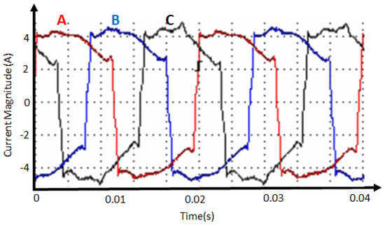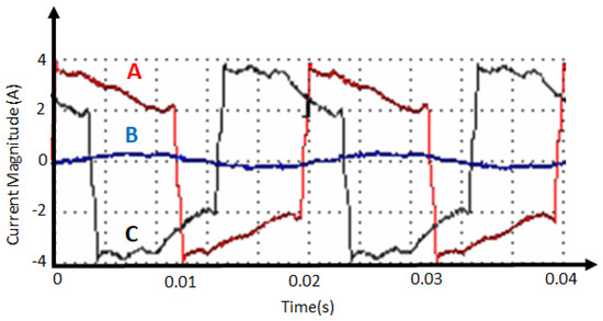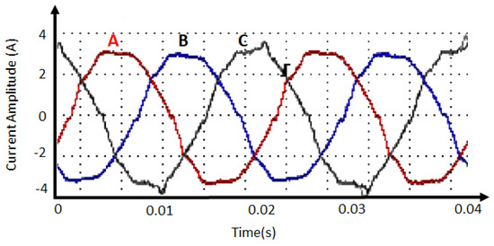 Three-phase supply currents of the laboratory system under balanced load.