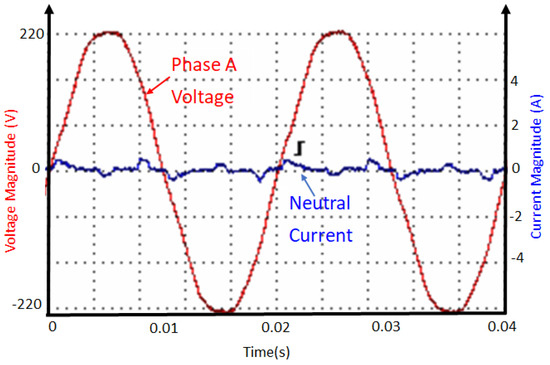 Neutral current with respect to phase A voltage of the laboratory system under balanced linear loads (without battery charging).