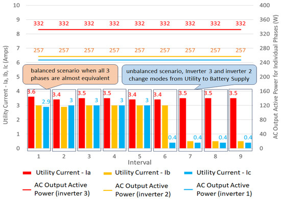 Figure 8 illustrates a laboratory-based three-phase supply network with a line-to-line voltage of 400 V and a line-to-ground voltage of 220 V. This network consists of single-phase inverters, each rated at 1 kW, and a backup battery of 12 V DC, 100 Ah, supplying single-phase varying loads.
