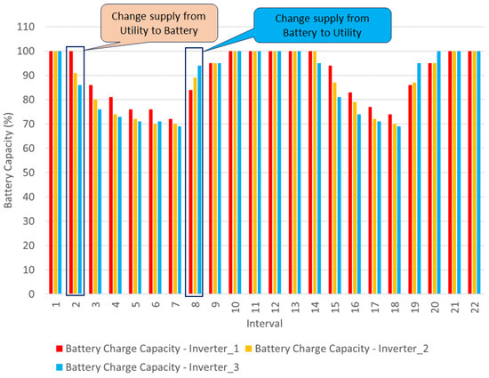 Figure A1 shows a flowchart of a system comprising multiple inverters in a transformer zone. The term ’cluster of inverters’ refers to a group of three inverters, with each inverter operating on a different phase. When a group of inverters powering local loads across three-phases approaches a state of near balance while operating in battery mode, they are switched back to the utility supply allowing the battery to charge when there is no solar PV. The concept of a 70% threshold of battery capacity aims to prevent the complete depletion of customer batteries, as this is not their primary function.