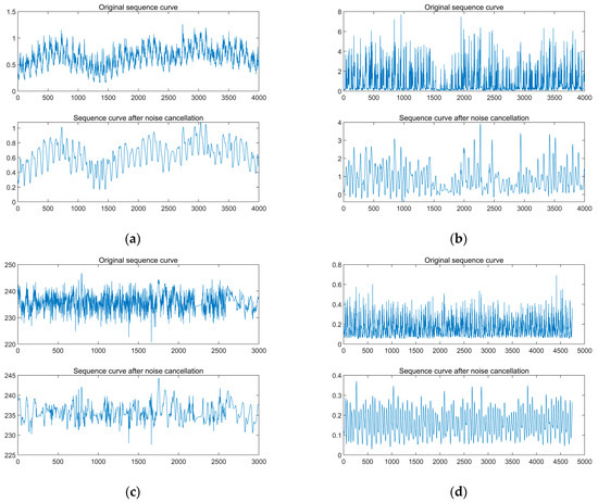 To eliminate the noise present in the 12 sets of load prediction data mentioned above, wavelet noise reduction is employed as a preliminary step, effectively diminishing the noise present in the load sequence. The noise reduction effect is visually presented in Figure 5.