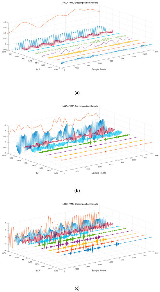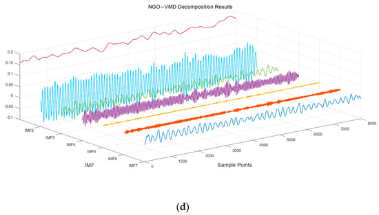 The decomposition yields the NGO–VMD decomposition results for each load type, as shown in Figure 6.