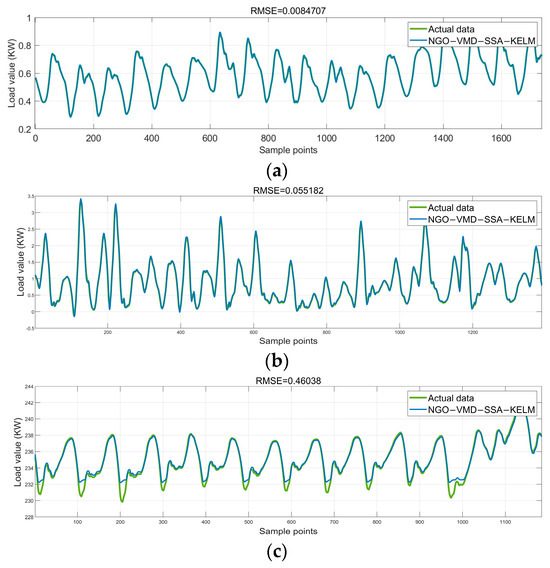 Utilizing the pre-defined SSA–KELM parameters, combined with the multimodal decomposition results from NGO–VMD, the training and test sets are divided in an 8:2 ratio to predict each sub-modal component individually. The prediction results of each sub-modal component are combined to yield the final load sequence prediction. Figure 7 displays the prediction results of the test set: