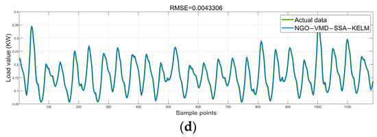 Furthermore, the comparison reveals that the predictions of the NGO−VMD−SSA−KELM model exhibit greater accuracy and universality. In summary, the load timing prediction model developed in this study demonstrates a high level of prediction stability and accuracy.